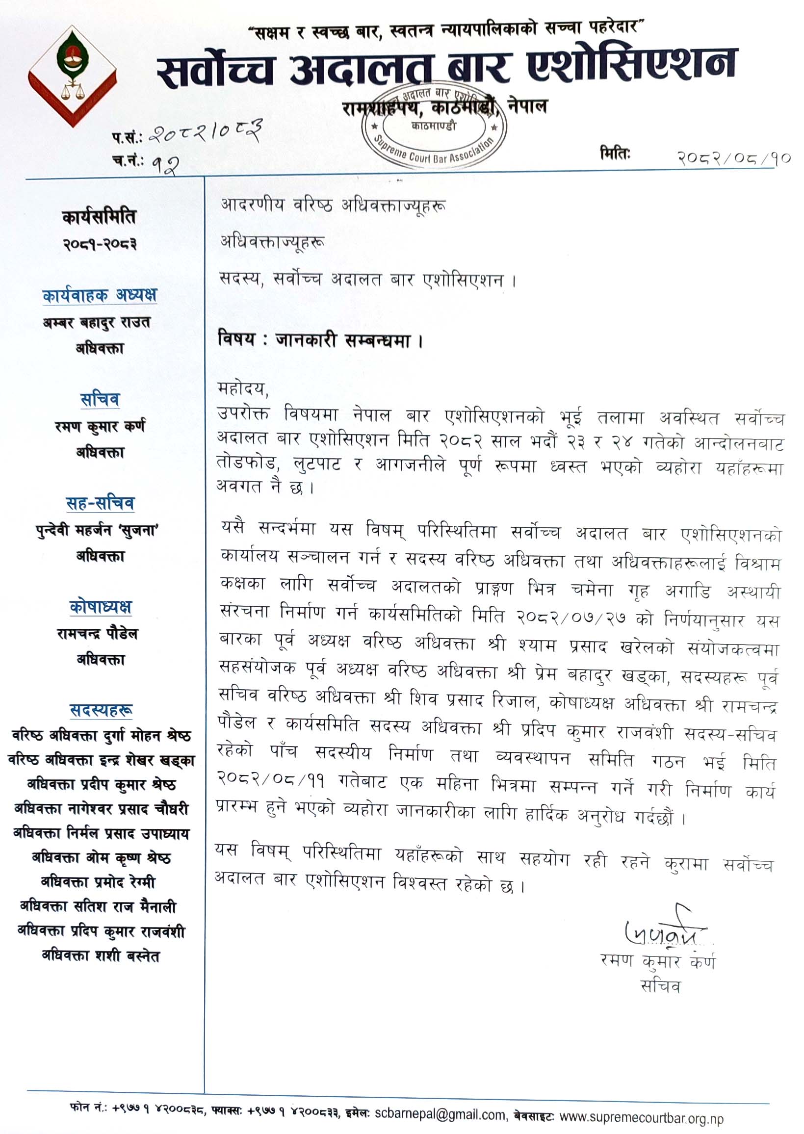 सर्वोच्च अदालत बार एशोसिएशन एक व्यावसायिक संस्था हो । स्वतन्त्र, सक्षम तथा उत्तरदायी न्यायपालिका, विधिको शासन, लोकतन्त्र र मानवअधिकारका लागि दृढतापूर्वक आफ्नो काम, कारबाही अगाडि बढाउन र सदस्यहरुको हकहित, मर्यादा एवम् वृत्ति विकासका काम गर्ने उद्देश्यले तत्कालीन कानूनमा स्नातक गरी सर्वोच्च अदालतमा कानूनी अभ्यास (वकालत) गर्ने कानून व्यवसायीहरूको सक्रियतामा वि.सं. २०३० साल फागुन ८ गते सर्वोच्च अदालत बार एशोसिएशनको स्थापना भएको हो ।