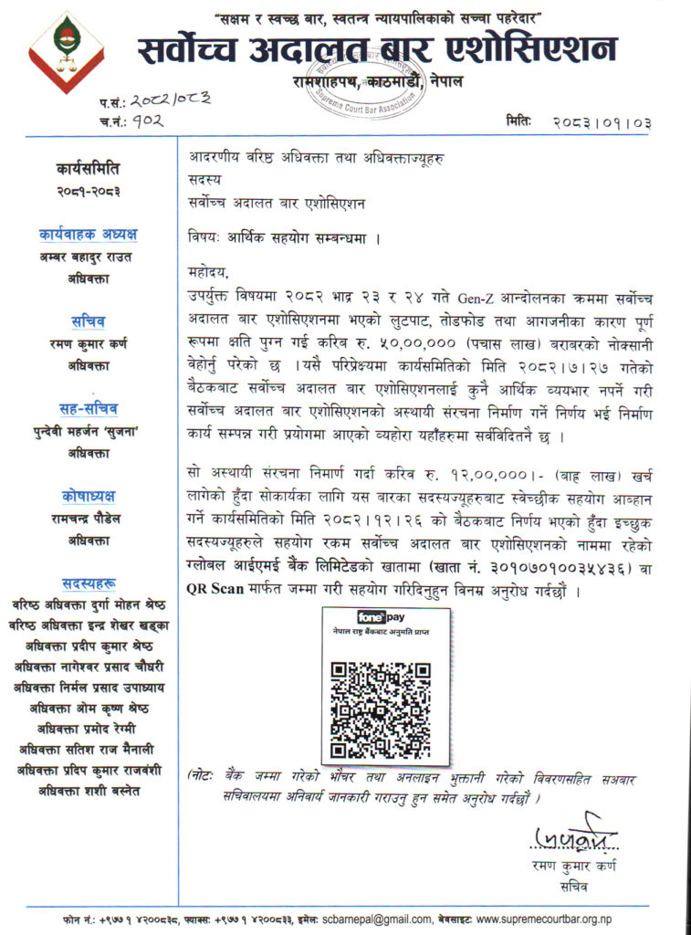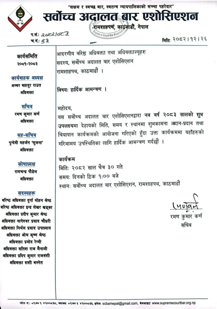 सर्वोच्च अदालत बार एशोसिएशनको ५२ औं बार दिवस सम्बन्धमा ( मिति २०८२.११.०४)