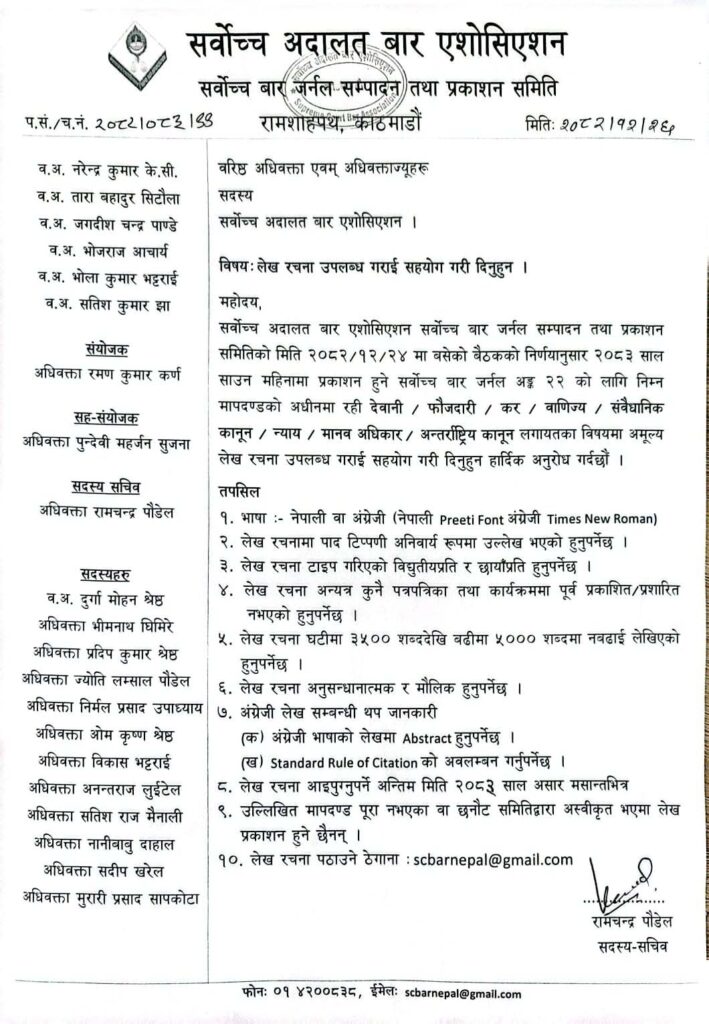 सर्वोच्च बार जर्नल अङ्क २२ को लागि लेख रचना उपलब्ध गराई सहयोग गरिदिने सम्बन्धमा (मितिः २०८२.१२.२६ गते)