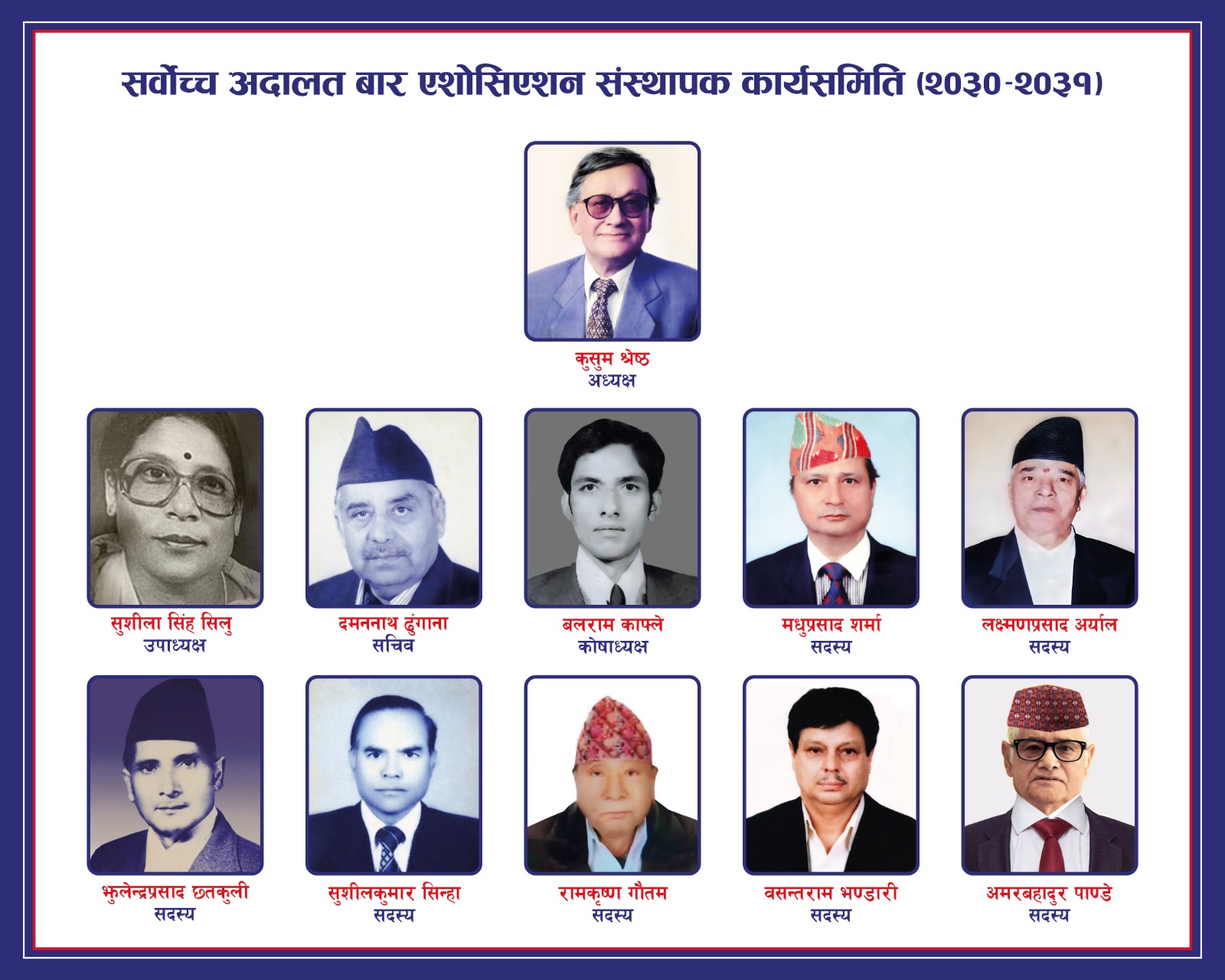 सोही पृष्ठभूमिमा सर्वोच्च अदालतमा बहस गर्ने प्राज्ञ कानून व्यवसायी वरिष्ठ अधिवक्ता कुसुम श्रेष्ठको नेतृत्वमा सर्वोच्च अदालत बार एशोसिएशनको स्थापना भएको हो । सर्वोच्च अदालत बार एशोसिएशनका संस्थापकहरू अध्यक्ष श्री कुसुम श्रेष्ठ, उपाध्यक्ष श्री सुशीला सिंह शिलु, सचिव श्री दमननाथ ढुङ्गाना, कोषाध्यक्ष श्री बलराम काफ्ले, र सदस्यहरूमा श्री मधुप्रसाद शर्मा, श्री लक्ष्मण प्रसाद अर्याल, श्री झुलेन्द्र प्रसाद छतकुली, श्री सुशीलकुमार सिन्हा, श्री रामकृष्ण गौतम, श्री वसन्तराम भण्डारी, श्री अम्वरबहादुर पाण्डे हुनुहुन्थ्यो । स्थापना मिति २०३० फागुन ८ गतेको सर्वोच्च अदालत बार एशाेसिएशनको प्रथम बैठकले प्रधान न्यायालय ऐन, २००८ लागू भएको दिन बैशाख २६ गते कानून दिवसका रुपमा मनाउने निर्णय गरेको थियो । साेही अनुरुप हालसम्म निरन्तर आफ्नो उद्देश्यमा दृढ संकल्पित भई विभिन्न गतिविधिमा सक्रिय रहेको छ ।